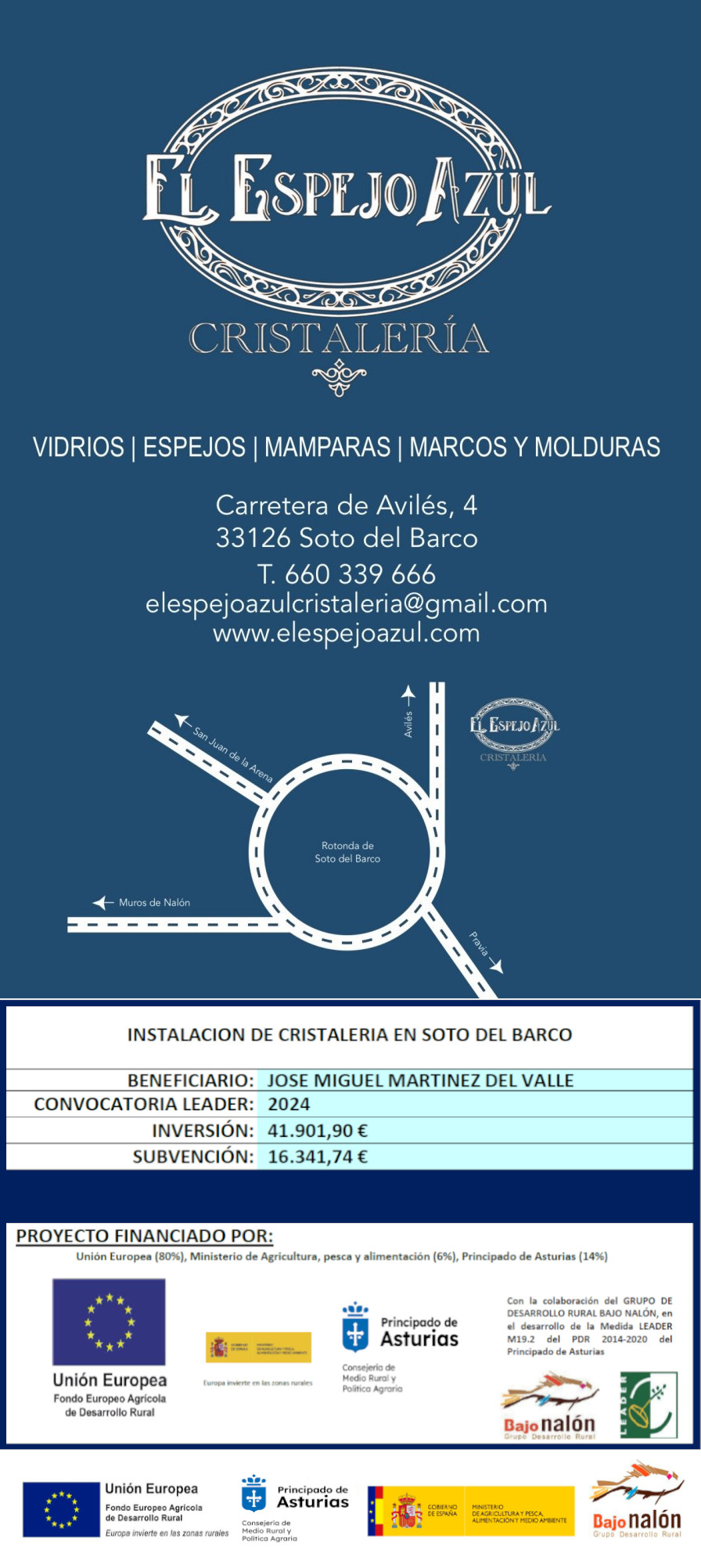 Cristalería El Espejo Azul es una empresa ubicada en SOTO DEL BARCO. Nos enorgullece nuestro compromiso con la excelencia y un trato cercano y personalizado con cada uno de nuestros clientes. Realizamos trabajos de alta calidad en todo el occidente de Asturias, siempre respetando nuestros valores fundamentales de profesionalidad, experiencia y cercanía.